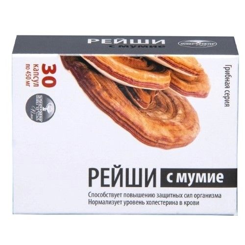 - Грибная серия «Рейши с мумие», в капсулах способствует повышению защитных сил организма