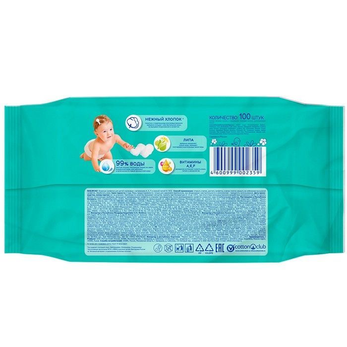 Салфетки детские AURA влажн. Солнце + Луна ECO хлопковые с вит. A,E,F и нежной липой №100 Коттон клаб/Россия