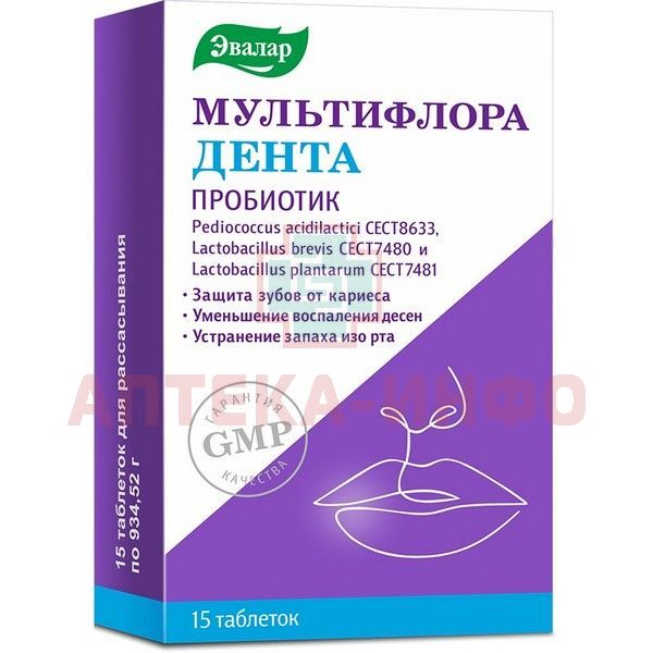 Мультифлора Эвалар Дента – это инновационный пробиотик для поддержания баланса микрофлоры полости рта. 1 таблетка содержит 1 миллиард (1 х 109КОЕ) пробиотических организмов Lactobacillus специальных штаммов brevis CECT7480, и plantarum CECT7481; Pediococcus acidilactici и 2,5 мкг (100 МЕ) витамина D.