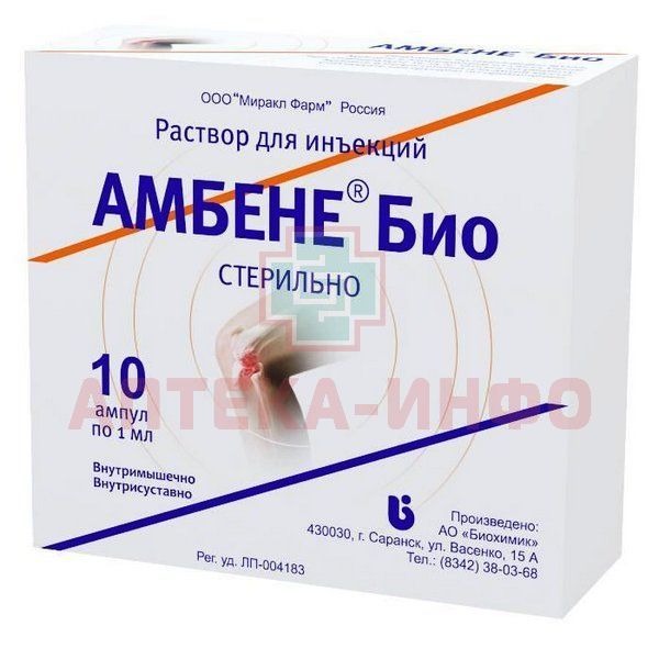 - АМБЕНЕ® Био предотвращает разрушение макромолекулярных структур нормальных тканей, стимулирует процессы восстановления в интерстициальной ткани и ткани суставного хряща, что объясняет его обезболивающее действие.