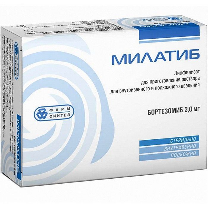 - Рекомендуемая доза бортезомиба составляет 1,3 мг/м2 площади поверхности тела два раза в неделю в течение 2 недель (дни 1, 4, 8 и 11) с последующим 10-дневным перерывом (дни 12-21). Между введением последовательных доз препарата Милатиб должно пройти не менее 72 ч. Степень клинического ответа рекомендуется оценивать после проведения 3 и 5 циклов лечения. В случае достижения полного клинического ответа рекомендуется проведение 2 дополнительных циклов лечения. При длительности лечения более 8 циклов Милатиб можно применять по стандартной схеме или по схеме поддерживающей терапии - еженедельно в течение 4 недель (дни 1, 8, 15, 22) с последующим 13-дневным периодом отдыха (дни 23-35).