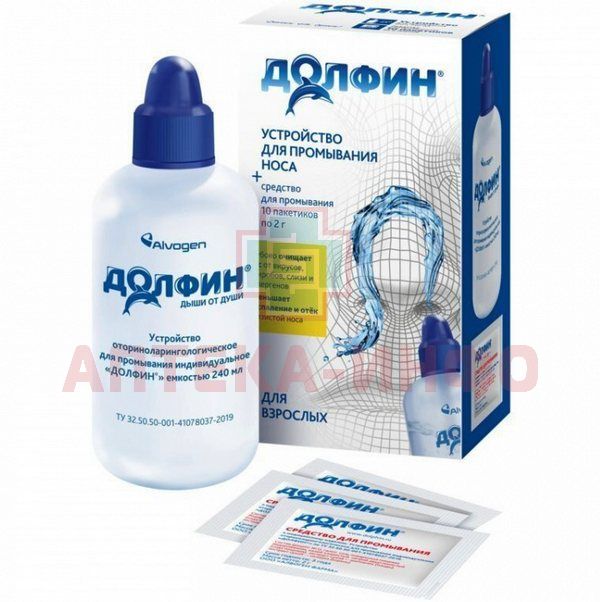 - Koмплeкc для пpoмывaния Дoлфин в инд.уп. Состав комплекта - Уcтpoйcтвo для пpoмывaния нoca Дoлфин (флакон) 240 мл - Порошок для промывания 2 г пакетики (саше) - 10 шт.