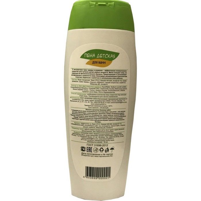 - ПЕНА ДЕТСКАЯ ДЛЯ ВАНН ИНФАРМА - содержит экстракты трав череды и ромашки. Увлажняет, смягчает кожу.