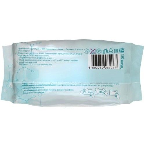 - Пропитка: вода, пропиленгликоль, хлоргексидин биглюконат, экстракт ромашки, парфюмерная композиция