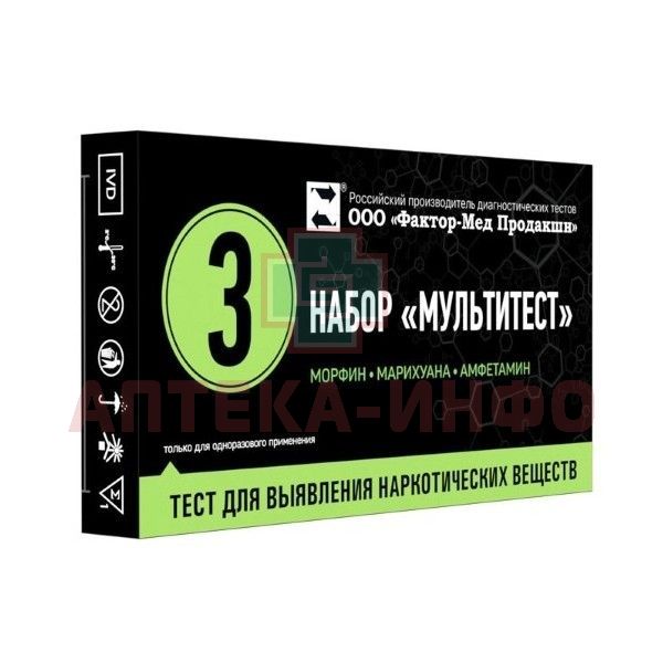 - Для профессионального применения и самотестирования. Набор «МУЛЬТИТЕСТ» предназначен для in vitro одноэтапного качественного выявления наркотических веществ и их метаболитов из ряда: (морфин, марихуана, амфетамин) в моче человека методом иммунохроматографического анализа.