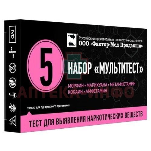 - Для профессионального применения и самотестирования. Набор «МУЛЬТИТЕСТ» предназначен для in vitro одноэтапного качественного выявления наркотических веществ и их метаболитов из ряда: (морфин,марихуана, метамфетамин,кокаин, амфетамин) в моче человека методом иммунохроматографического анализа.