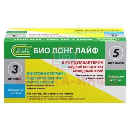 Бифидумбактерин фл.(жидкий концентрат бифидобактерий) 10мл №10 + лактобактерин + жид. концентрат фл. 10мл №10 Био Лонг Лайф