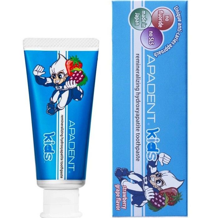 - APADENT Kids помогает сохранить зубы здоровыми до и во время смены молочных зубов на постоянные. Безопасна при проглатывании и подходит для самых маленьких. Землянично-виноградный вкус облегчает процесс приучения к чистке зубов - дети будут чистить зубы с удовольствием!