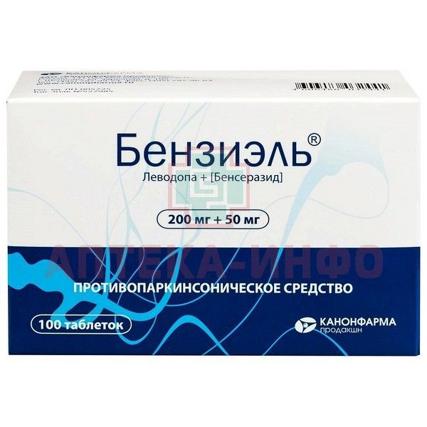 - Дополнительно: 125 мг (100 мг леводопы + 25 мг бепсеразида), максимально допустимая суточная доза - 500 мг (400 мг леводопы + 100 мг бепсеразида) препарата Бензиэль®.
