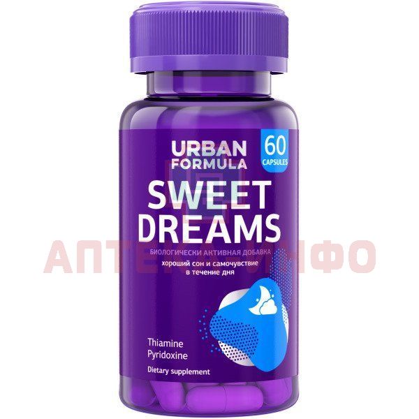 Биологически активная добавка к пище Urban Formula Sweet Dreams. Рекомендуется в качестве дополнительного источника витаминов В1 и В6.Комплекс направлен на регуляцию циркадных ритмов и повышение качества сна.