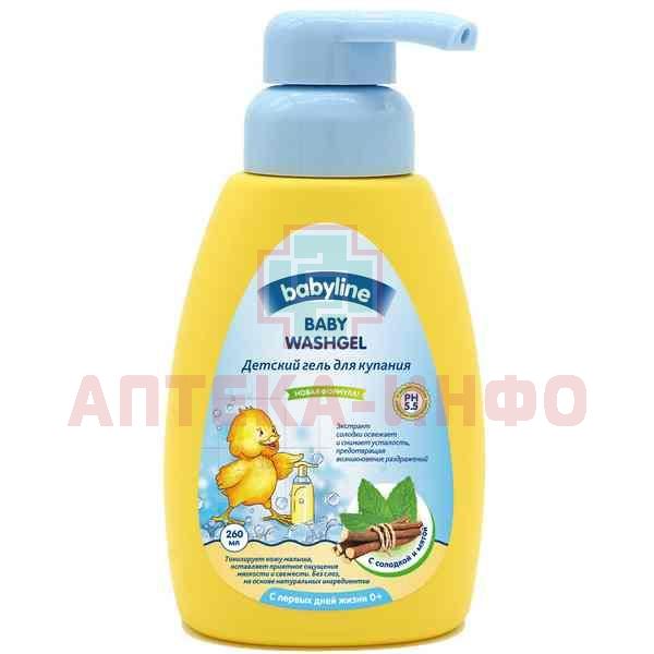 Гель для купания Babyline протестирован аллергологами. Без мыла и красителей, pH-нейтрален.