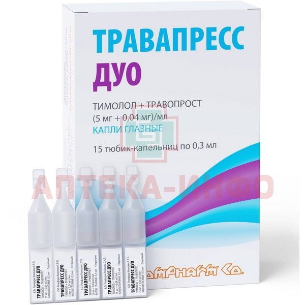 - Препарат Травапресс Дуо содержит два действующих вещества: тимолол и травопрост. Оба компонента снижают внутриглазное давление. Благодаря взаимодополняющим механизмам их действия, снижение внутриглазного давления под влиянием комбинации более значительное, чем при действии каждого из этих компонентов в отдельности.