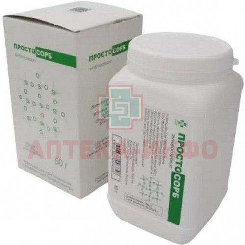 - ПРОСТОСОРБ - неорганический, неселективный, полифункциональный энтеросорбент на основе высокодисперсного кремнезема с размерами частиц до 0,09 мм, с химической формулой SiO2. Удельная площадь поверхности препарата порядка 300 м2/г. Емкость адсорбции препарата при внутреннем употреблении не менее 220 мг/г.