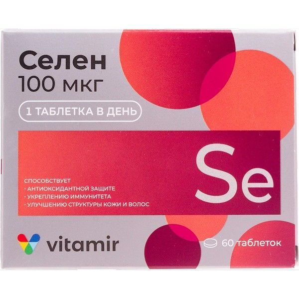 Селен — один из жизненно необходимых для человека ультрамикроэлементов. В составе БАД «Селен 100 мкг ВИТАМИР®» селен содержится в виде селенометионина — легкоусваиваемой органической формы. В организме селен выполняет множество функций, входит в состав многих ферментов.