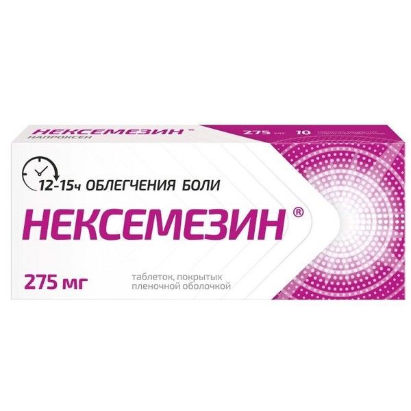 - Нексемезин обладает обезболивающим, жаропонижающим и противовоспалительным действием. Механизм действия связан с неселективным ингибированием активности циклооксигеназы-1 и -2 (ЦОГ-1, ЦОГ-2). Препарат Нексемезин, таблетки, покрытые пленочной оболочкой, хорошо растворяется, быстро всасывается из желудочно-кишечного тракта и обеспечивает быстрое наступление обезболивающего эффекта.