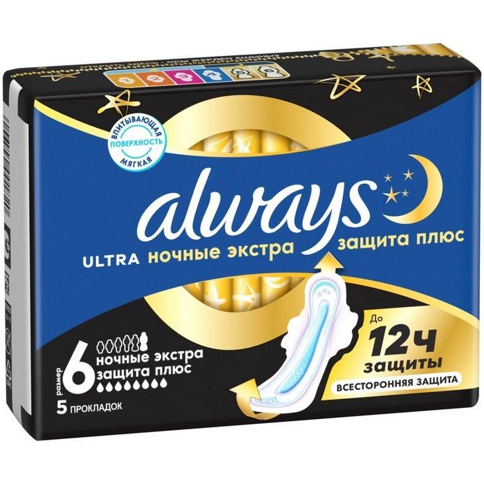 - Наслаждайтесь спокойным сном благодаря тройной защите: гигиенические прокладки ALWAYS Ultra Secure Night Plus (ночные экстра защита плюс) с крылышками обеспечивают тройную защиту от протеканий и необходимости менять прокладку ночью. Увеличенные на 9% передняя часть и на 85% - задняя часть (по сравнению с Always Ultra Normal) в сочетании с технологией ЗащитныеБарьеры обеспечивают максимальную защиту от протеканий во время сна. Система СразуСухо впитывает влагу за считанные секунды и не дает ей соприкасаться с кожей. Технология БлокЗапаха нейтрализует неприятные запахи, придавая ощущение свежести и чистоты. Спите спокойно благодаря тройной защите ALWAYS Ultra.