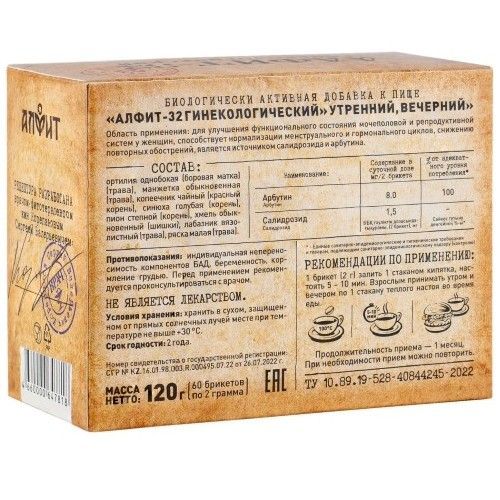- АЛФИТ-32 ГИНЕКОЛОГИЧЕСКИЙ УТРЕННИЙ/ВЕЧЕРНИЙ - Биологически активная добавка (БАД) к пище для улучшения функционального состояния мочеполовой и репродуктивной систем у женщин, способствует нормализации менструального и гормонального циклов, снижению повторных обострений