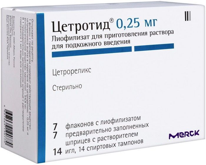 - Лиофилизат для приготовления раствора для подкожного введения 0,25 мг цетрореликса - 7 флаконов с лиофилизатом;