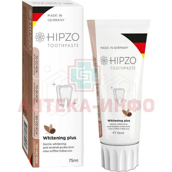 Отбеливающая зубная паста Hipzo Whitening Plus безопасно отбеливает и защищает, реминерализует зубную эмаль и уменьшает зубной налет.
