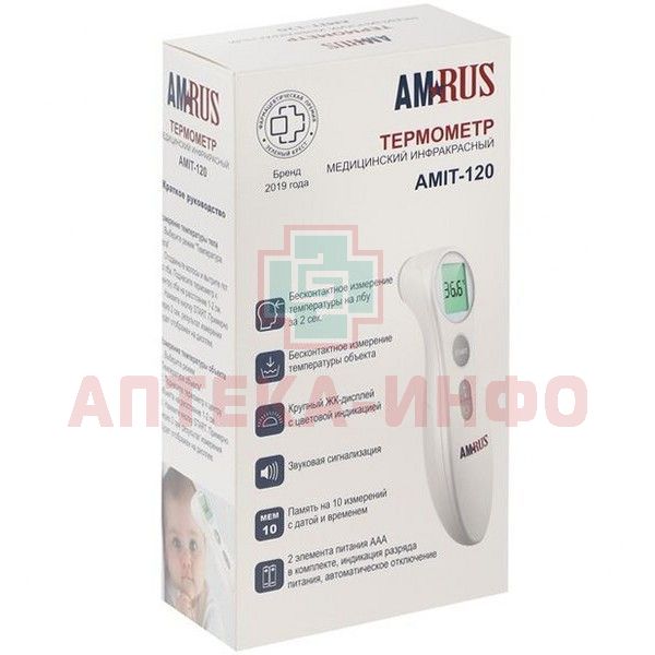 - Инфракрасный медицинский термометр AMRUS AMIT-120 предназначен для измерения температуры тела человека (на лбу) и предметов бесконтактным способом.
