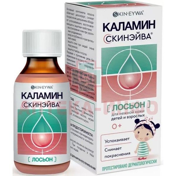 - Входящие в состав активные компоненты Лосьона Каламин (СКИНЭЙВА) SKINEYWA® обладает выраженным подсушивающим, восстанавливающим, и успокаивающим свойствами. Существенно облегчают ощущения дискомфорта, снимают покраснения и формирует защитный барьер на коже.