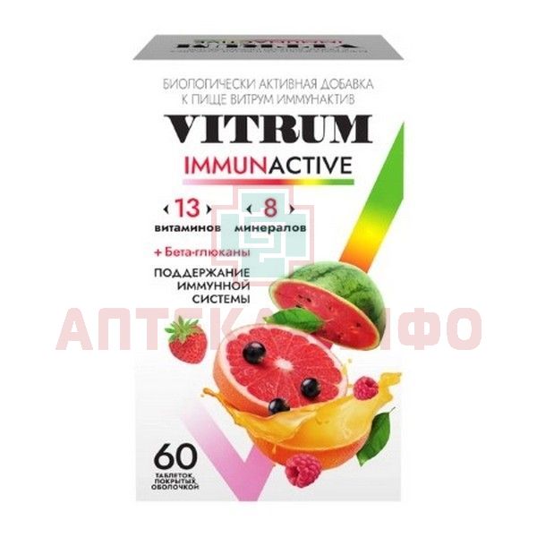 - Витаминно-минеральный комплекс ВИТРУМ ИММУНАКТИВ VITRUM IMMUNACTIVE содержит 13 витаминов и 8 минералов, а также бета-глюканы и биофлаваноидный комплекс - необходимые компоненты, которые синергично работают для поддержки иммунитета:
