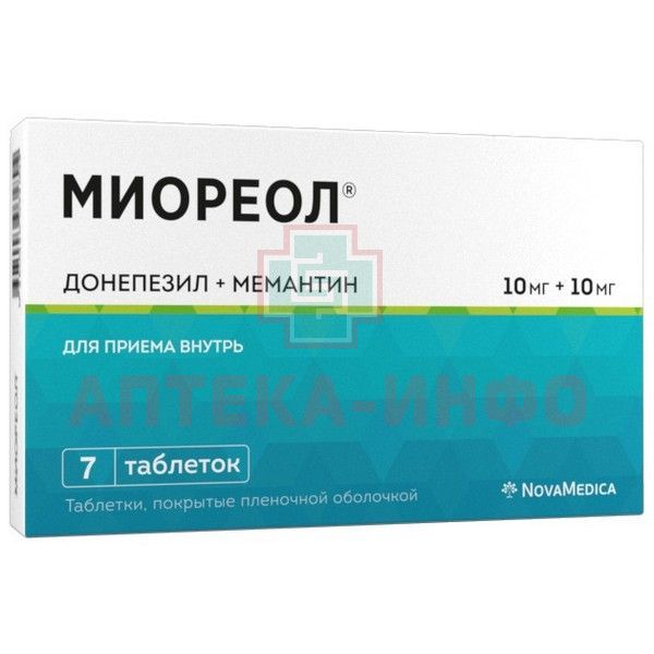 - Рекомендуемая начальная доза составляет Донепезил 10 мг + Мемантин 5 мг (одна таблетка препарата МИОРЕОЛ® 10 мг + 5 мг).