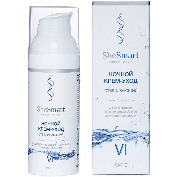 - SHESMART КРЕМ-УХОД НОЧНОЙ ОТБЕЛИВАЮЩИЙ С ПЕТИДАМИ ВИТАМИНОМ Е ВИТАМИНОМ А И НИАЦИНАМИДОМ - для ухода за кожей в ночное время.