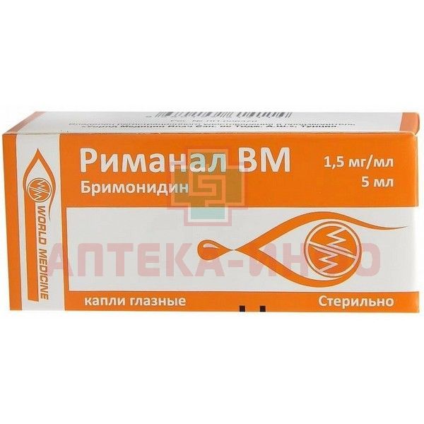- Риманал ВМ - селективный альфа2-адреномиметик. Максимальное снижение внутриглазного давления (ВГД) достигается через 2 часа. Гипотензивное действие бримонидина обеспечивается за счет снижения образования и повышения оттока внутриглазной жидкости по увеосклеральному пути.
