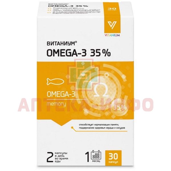 - Omega-3 35 % ВИТАНИУМ ® - комплекс незаменимых омега-3 кислот (эйкозапентаеновой и докозагексаеновой (ЭПК и ДГК)) для нутритивной поддержки головного мозга, сетчатки глаз и сердечно-сосудистой системы, повышения когнитивных способностей.