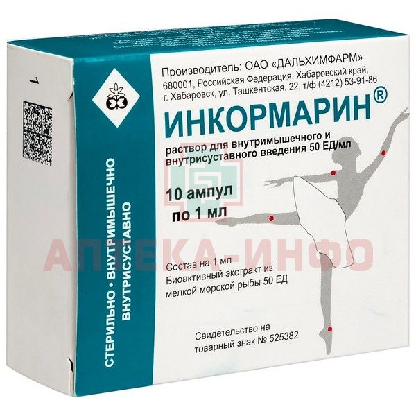 - Лекарственный препарат Инкормарин® предотвращает разрушение макромолекулярных структур нормальных тканей, стимулирует процессы восстановления в интерстициальной ткани и ткани суставного хряща, что объясняет его обезболивающее действие.
