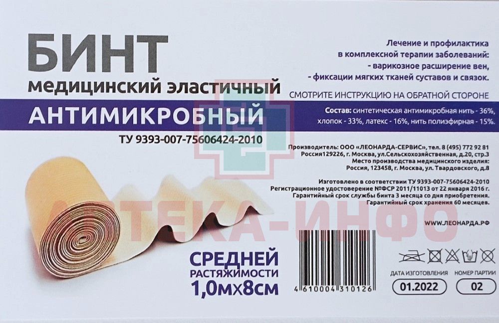 Бинт эласт. антимикробный 8см х 1м Леонарда-Сервис/Россия