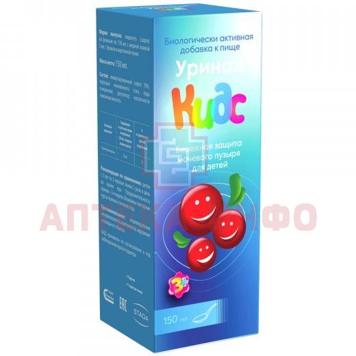 - Биологически активная добавка к пище Уринал Кидс (далее - Уринал Кидс) содержит натуральный активный компонент, безопасный для применения у детей и является продуманным по наполнению продуктом европейского качества. Уринал Кидс обеспечивает защиту почек, мочевого пузыря и мочевыводящих путей от вредоносных бактерий и негативных факторов окружающей среды, которые особенно уязвимо влияют на детские органы мочевыделительной системы.