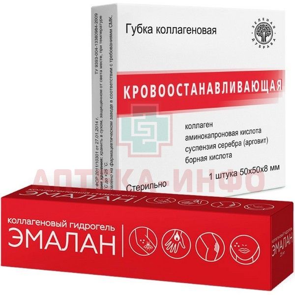 - Набор: Губка коллагеновая кровоостанавливающая - 1 шт в уп, гидрогель Эмалан - 25 мл туба в уп.