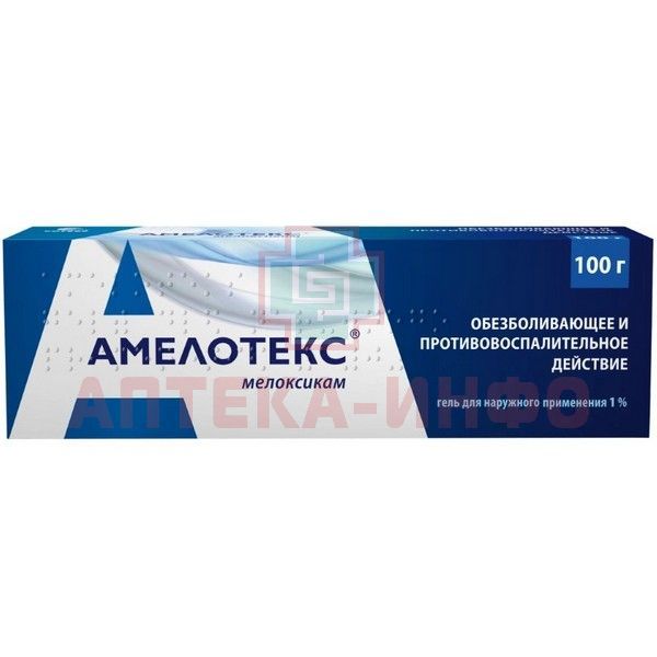 - АМЕЛОТЕКС* гель содержит мелоксикам - нестероидный противовоспалительный препарат (НПВП), обладающий обезболивающим, противовоспалительным действием. Противовоспалительное действие связано с торможением ферментативной активности циклооксигеназы-2 (ЦОГ-2), участвующей в биосинтезе простагландинов в области воспаления. В меньшей степени мелоксикам действует на циклооксигеназу-1 (ЦОГ-1), участвующую в синтезе простагландина, защищающего слизистую оболочку желудочно-кишечного тракта и принимающего участие в регуляции кровотока в почках.