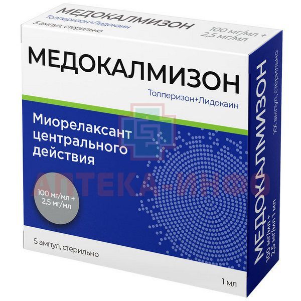 Действующие вещества: толперизона гидрохлорид – 100,0 мг, лидокаина гидрохлорида моногидрат (в пересчете на лидокаина гидрохлорид) – 2,5 мг