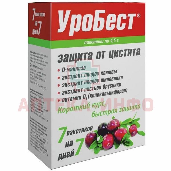 - УроБест® содержит компоненты защиты от цистита, дополняющие действие друг друга. D-манноза и экстракт плодов клюквы предотвращают прилипание бактерий к внутренней стенке мочевого пузыря, а большое количество экстракта листьев брусники оказывает выраженный мочегонный эффект, благодаря чему ускоряется выведение бактерий, вызывающих цистит. Витамин D3 и экстракт плодов шиповника усиливают действие D-маннозы, экстракта плодов клюквы и экстракта листьев брусники благодаря воздействию на иммунную систему и общеукрепляющему действию.