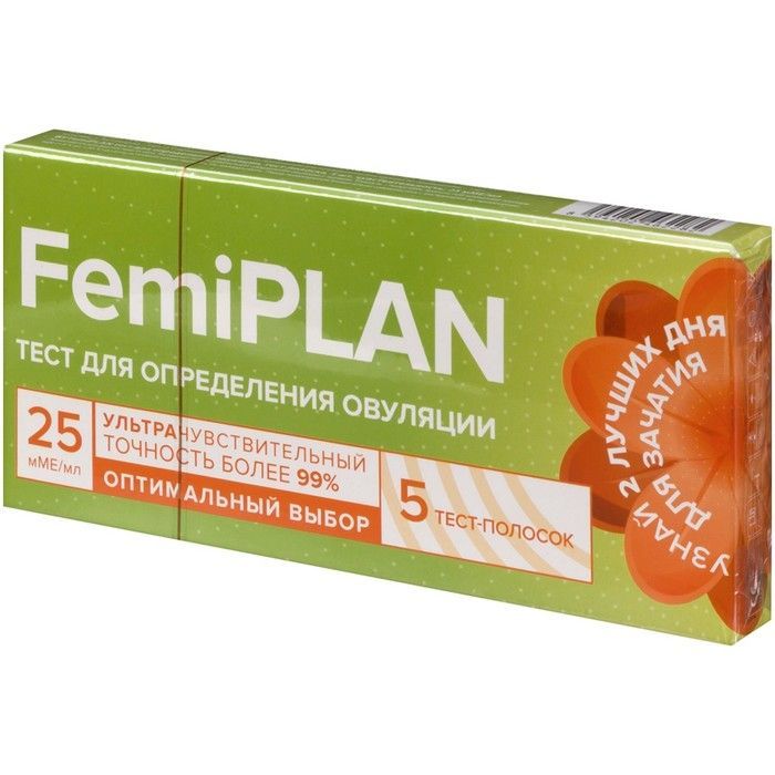 Тест для определения овуляции FemiPlan - бумажные тест-полоски, пропитанные реагентом, на пластиковой основе с контрольной линией.Чувствительность: 25 мМЕ/мл.Точность более 99,9%.Тесты для определения овуляции выявляют максимальный рост лютеинизирующего гормона, который происходит обычно за 24-36 часов перед овуляцией и, таким образом, указывают те 2 дня, когда вероятность зачатия высока.Тест на овуляцию определяет повышение содержания лютеинизирующего гормона (ЛГ) в моче.ЛГ - это гормон фертильности - содержится в моче каждой здоровой женщины, чувствительность тестов позволяет выявлять его в концентрации от 25 мМЕ/мл.Перед применением внимательно ознакомьтесь с инструкцией-вкладышем.