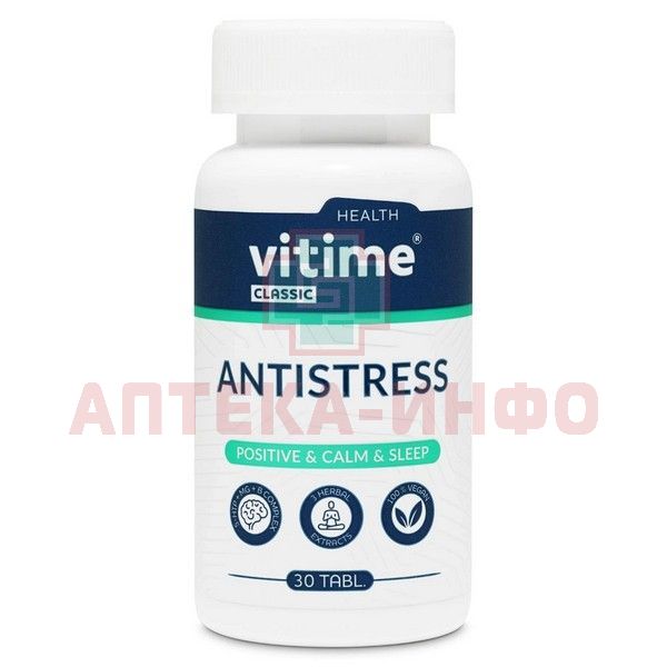 - VITIME CLASSIC АНТИСТРЕСС («Витайм Классик Антистресс») - Биологически активная добавка (БАД) к пище - комплекс 5-HTP, растительных экстрактов, витаминов группы В и магния для спокойствия, хорошего настроения и здорового сна при стрессах и повышенных нагрузках.