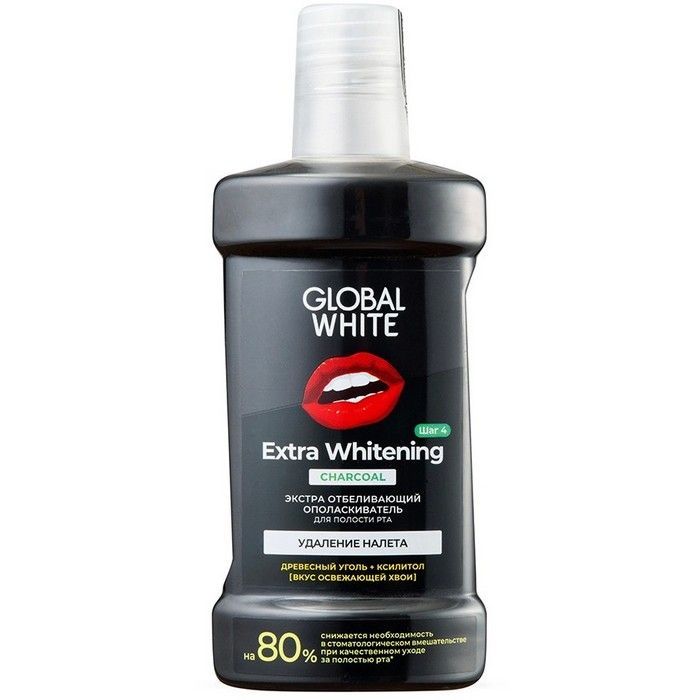 - GLOBAL WHITE ОПОЛАСКИВАТЕЛЬ ДЛЯ ПОЛОСТИ РТА ЭКСТРА ОТБЕЛИВАЮЩИЙ С ДРЕВЕСНЫМ УГЛЕМ.