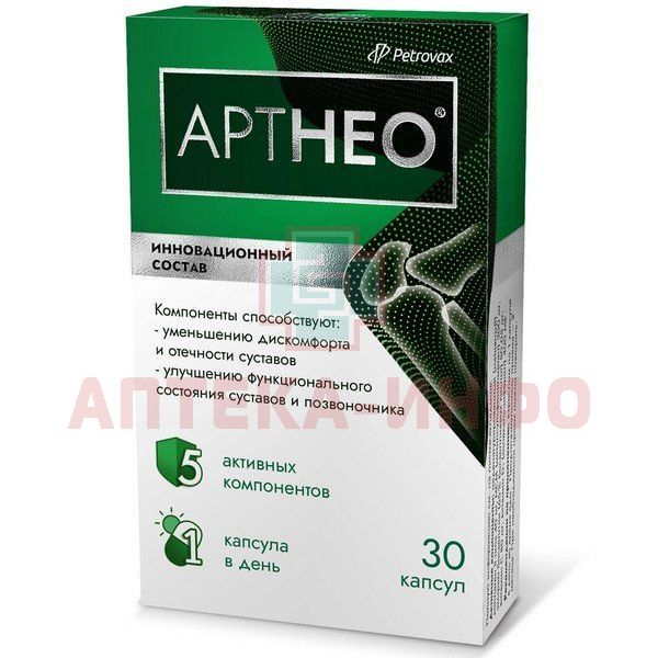 - АРТНЕО® - это инновационный 5-ти компонентный состав** для здоровья суставов и позвоночника. Специально подобранные компоненты - неденатурированный коллаген II типа, МСМ, босвелли¬евые кислоты, витамины С и D3 - обладают комплексным действи¬ем, способствуя уменьшению дискомфорта, отечности, болезнен¬ных ощущений, скованности, а также восстановлению и поддержа¬нию функционального состояния суставов и позвоночника.