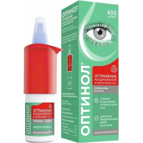 Препарат Оптинол Тетризолин обладает сосудосуживающим действием и уменьшает отек тканей. Местное применение раствора препарата Оптинол Тетризолин на слизистой оболочке глаза и век приводит к сужению кровеносных сосудов глаза в течение нескольких минут и продолжается 4-8 часов.Если улучшение не наступило или Вы чувствуете ухудшение, необходимо обратиться к врачу.
