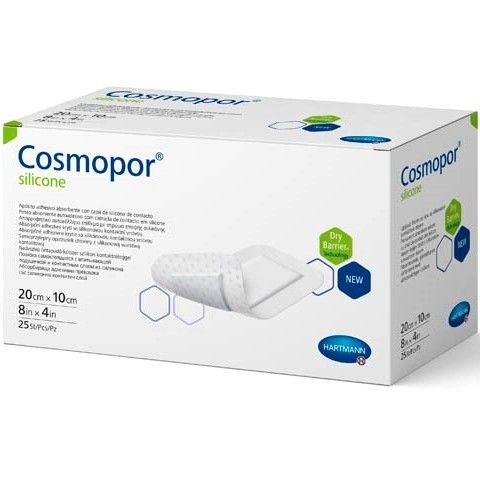- Cosmopor® silicone/Кocмoпop силикон представляет собой неактивную одноразовую самоклеящуюся стерильную и полупроницаемую повязку на рану (гидроцеллюлярную тонкую повязку), состоящую из нетканого материала основы (материала-носителя) и впитывающей подушечки для раны. Обе части повязки покрыты силиконовым клеевым перфорированным слоем и защищены пленкой.