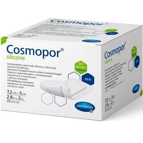 - Cosmopor® silicone/Кocмoпop силикон представляет собой неактивную одноразовую самоклеящуюся стерильную и полупроницаемую повязку на рану (гидроцеллюлярную тонкую повязку), состоящую из нетканого материала основы (материала-носителя) и впитывающей подушечки для раны. Обе части повязки покрыты силиконовым клеевым перфорированным слоем и защищены пленкой.