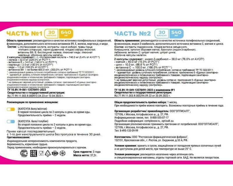 - Экстракт подорожника, плодов витекса священного, боярышника, ортилии (боровая матка), брокколи (индол-3-карбинол), лабазника; витамин С; цитрат магния, цитрат цинка; оболочка капсулы: (желатин, красители Е171 и Е 132).