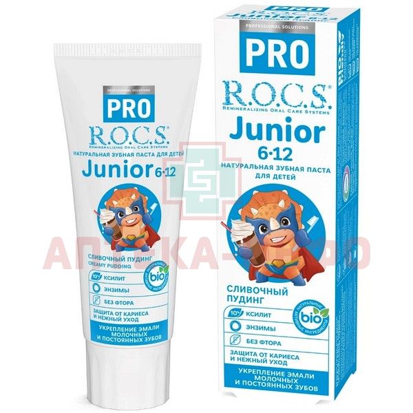 - Зубная паста "R.O.C.S. PRO. Junior Сливочный пудинг" обеспечивает эффективную защиту молочных и первых постоянных зубов от кариеса за счет сочетания биоактивных и минеральных компонентов.