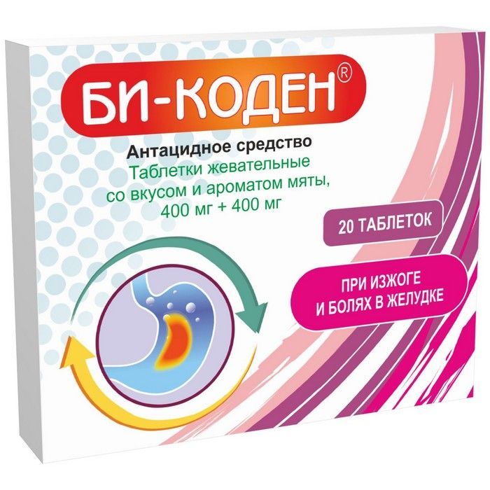 Би-Коден - это невсасывающийся антацидный препарат, в составе которого сбалансированная комбинация гидроксида алюминия и гидроксида магния. Би-Коден защищает клетки слизистой оболочки желудка без вторичной гиперсекреции, снижает кислотность желудочного сока, повышает рН в желудке; инактивирует пепсин, снижает его активность; устраняет диспептические явления; усиливает регенеративные процессы в слизистой оболочке желудка; уменьшает воздействие повреждающих факторов на слизистую оболочку пищевода и желудка благодаря адсорбирующим и обволакивающим свойствам; связывает соляную кислоту в желудке.Описание