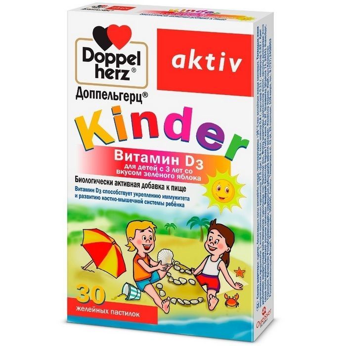 - «Kinder Витамин D3 для детей с 3 лет со вкусом зеленого яблока» товарного знака «Доппельгерц®»
