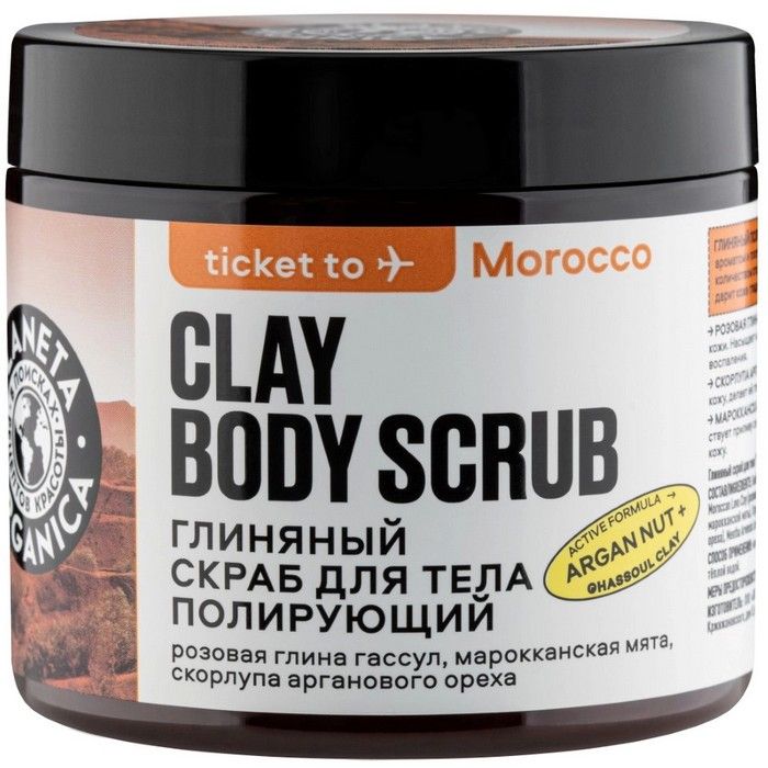 - PLANETA ORGANICA СКРАБ ДЛЯ ТЕЛА ГЛИНЯНЫЙ ПОЛИРУЮЩИЙ TICKET TO MOROCCO - с искрящимся ароматом и плотной текстурой, насыщенной большим количеством отшелушивающих частичек.
