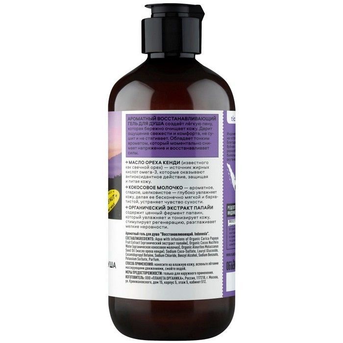 - PLANETA ORGANICA ГЕЛЬ ДЛЯ ДУША АРОМАТНЫЙ ВОССТАНАВЛИВАЮЩИЙ TICKET TO INDONESIA - создаёт лёгкую пену, которая бережно очищает кожу.